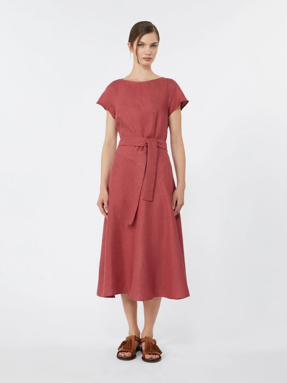 Midi dress with a flared silhouette, finished with an asymmetrical seam motif on the front that adds movement.